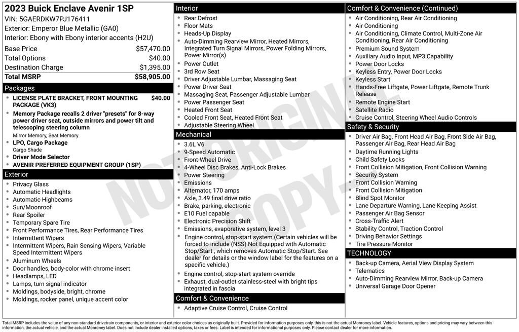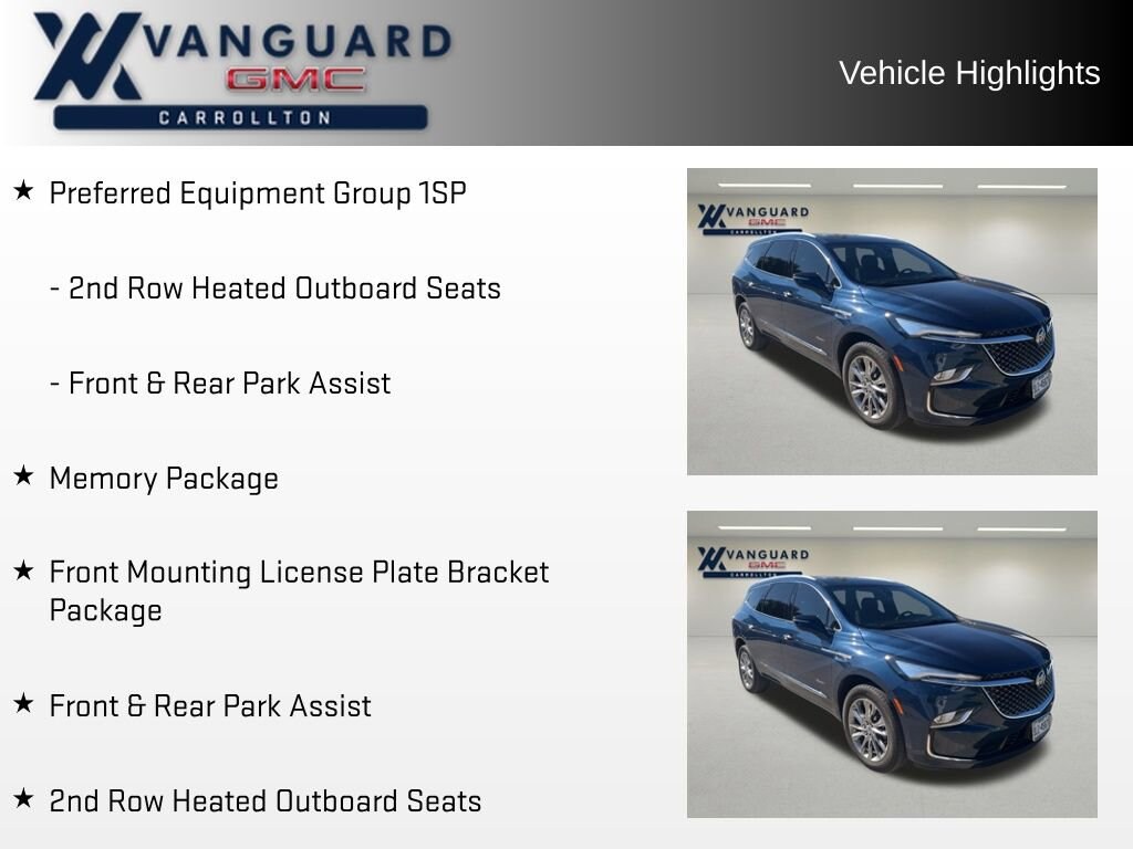 Discover the epitome of luxury and capability with the 2023 Buick Enclave Avenir. This stunning SUV combines sophisticated design, advanced technology, and unparalleled comfort, making it the perfect companion for your every adventure. Front & Rear Park Assist 2nd Row Heated Outboard Seats Navigation System Bose Performance-Enhanced 10-Speaker System Wireless Apple CarPlay/Wireless Android Auto Heated Steering Wheel Power LiftgateStep inside the Enclave Avenir and be captivated by its meticulously crafted interior. Sink into the supple, perforated leather-appointed seats, which offer both heating and ventilation for year-round comfort. The driver and front passenger will appreciate the 4-way power lumbar support, ensuring a personalized fit and exceptional support during long drives.Elevate your driving experience with the Enclave Avenir's cutting-edge technology. The Buick Infotainment System, complete with a high-resolution touchscreen and voice recognition, seamlessly integrates your smartphone, providing access to your favorite music, navigation, and more. The Heads-Up Display projects critical driving information directly into your line of sight, allowing you to stay focused on the road ahead.Beneath the sculpted exterior, the Enclave Avenir's 3.6L V6 engine delivers a thrilling performance, with 310 horsepower and a smooth 9-speed automatic transmission. Paired with Buick's renowned handling and ride quality, this SUV offers a driving experience that is both exhilarating and refined.Safety is paramount in the Enclave Avenir, with a comprehensive suite of advanced driver assistance technologies. From the Rear Camera Mirror and Surround Vision Camera to the Automatic Emergency Braking and Lane Keep Assist, this SUV is designed to help keep you and your loved ones secure on every journey.Elevate your lifestyle with the 2023 Buick Enclave Avenir. Experience the perfect blend of luxury, technology, and capability that will transform the way you think about SUVs. Visit our showroom today and let us demonstrate how this exceptional vehicle can enhance your driving experience.