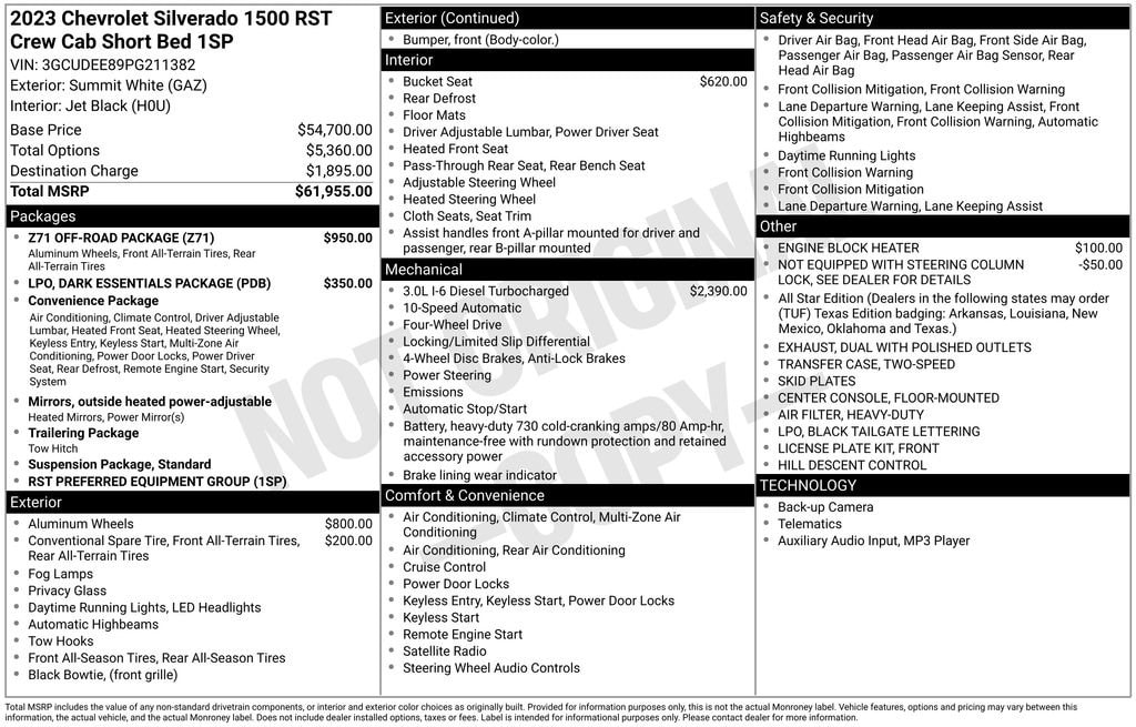 2023 Chevrolet Silverado 1500 RSTClean CARFAX. This vehicle comes with the following features and options : 10-Speed Automatic, 4WD, Black Cloth.Contingent upon dealer acceptance of terms. Terms may vary. Certification and additional reconditioning fees may apply.
