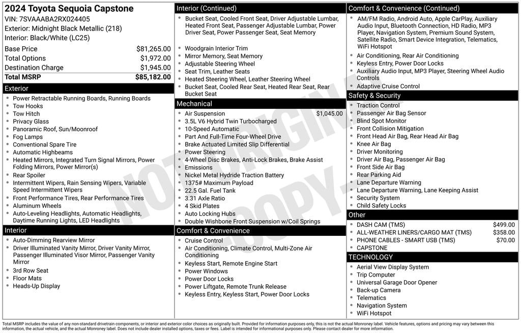 Elevate your driving experience with this exceptional 2024 Toyota Sequoia Capstone. Boasting a striking Black exterior, this full-size SUV is powered by a V6 Hybrid engine and a 10-Speed Automatic transmission, delivering a remarkable blend of power and efficiency with 4WD capabilities.- Load-Leveling Rear Height Control Air Suspension- AVS- Dash Cam (TMS)- All-Weather Liners/Cargo Mat (TMS)- Phone Cables - Smart USB (TMS)- Navigation System- Front Dual Zone A/C- Remote Keyless Entry- Traction Control- ABS Brakes- Power Moonroof- Power Liftgate- Electronic Stability Control- Active Cruise ControlWith an impressive 19 MPG in the city and 22 MPG on the highway, this Sequoia Capstone offers the perfect balance of performance and fuel economy. Step inside and experience the premium comfort of the Semi-Aniline Leather Seat Trim, Heated and Ventilated Front Seats, and Heated Rear Seats, all while enjoying the convenience of the Heads-Up Display and the exceptional sound quality of the JBL Premium Audio System.Packed with advanced technology and safety features, the 2024 Toyota Sequoia Capstone is the ultimate expression of versatility and luxury. From the Automatic Power Extending Running Boards to the Panoramic Moonroof, every detail has been carefully crafted to elevate your driving experience.Whether you're embarking on a family adventure or navigating the daily commute, this Sequoia Capstone is ready to exceed your expectations. Discover the perfect blend of power, comfort, and convenience schedule a test drive today and experience the difference for yourself.